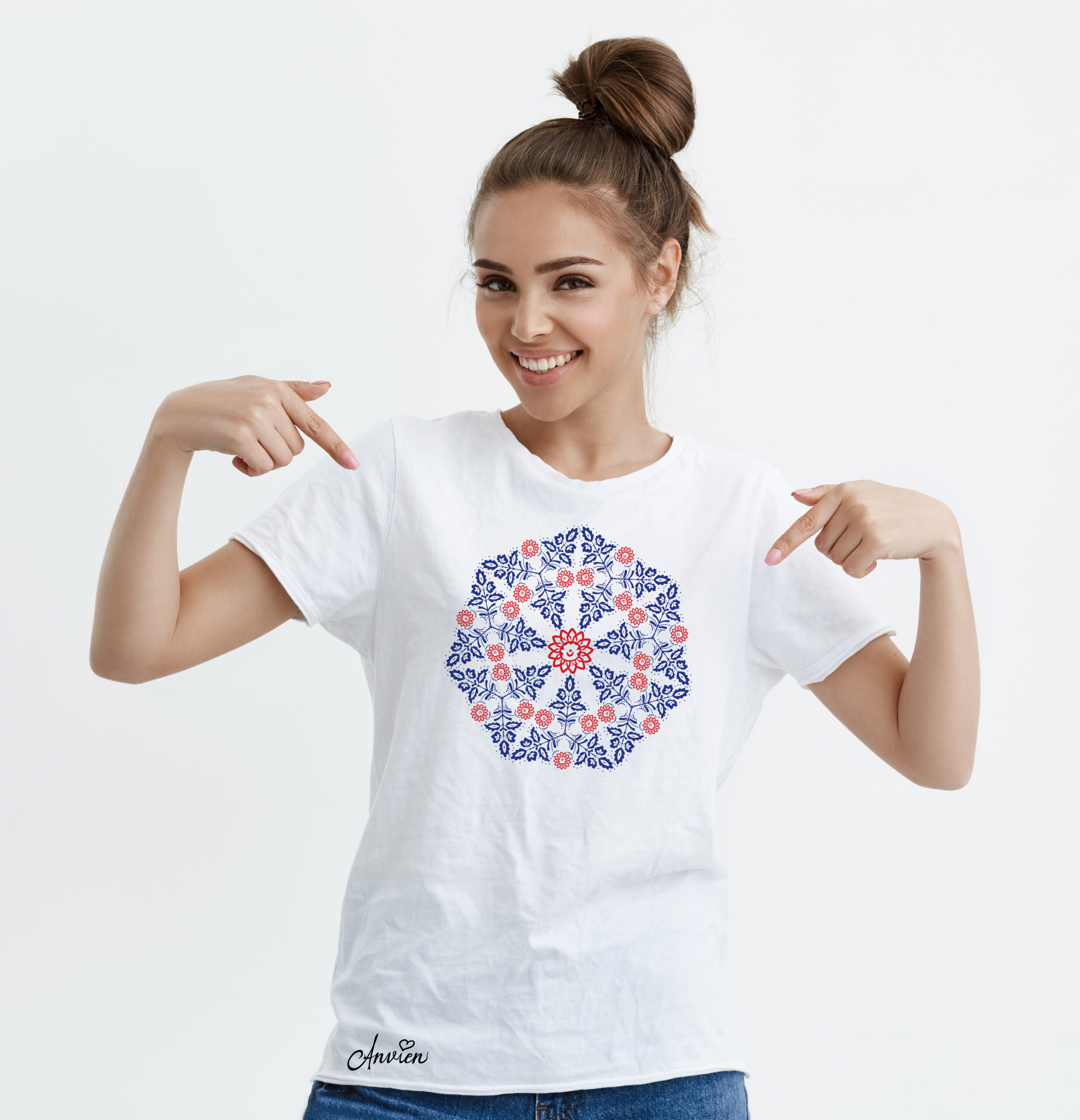 Oživte tradičné kroje moderným spôsobom! Naše tričko „Tanec v ornamentoch“ nesie jemný, no pútavý motív tanečného páru obklopeného ľudovými ornamentmi. Ideálne na bežné nosenie alebo tematické udalosti. Kvalitný bavlnený materiál zaručuje maximálne pohodlie.